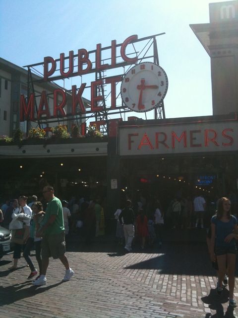 スタジアム駅からまたライトレールに乗り、ダウンタウンへ向かいました。まず寄ったのは、シアトルで観光客が必ず行く場所「パイクプレイスマーケット」です。